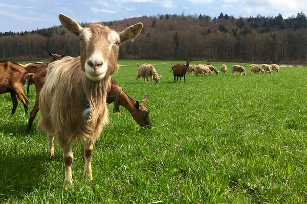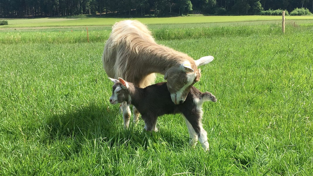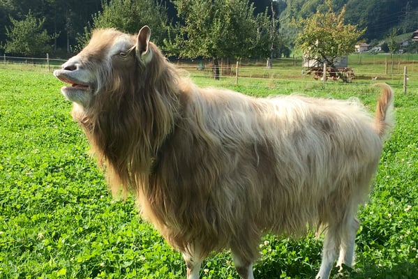 Die Toggenburgerziege ist ruhig und weist eine grosse Widerstandsfähigkeit auf. Sie ist für ihre gute Raufutterverwertung bekannt. Die Ziegen lieben gut strukturierte Weiden. Stauden und auch Dornensträucher entlauben sie mit Wonne. Wir beweiden in Zusammenarbeit mit der Umweltgruppe Hindelbank zwei Naturschutzgebiete der Pro Natura. Das freut die Ziegen riesig und es hilft zugleich die Gebiete offen zu halten. Zu unserer Herde zählen zurzeit 42 Muttertiere, ein stattlicher Ziegenbock und ein paar Gitzi für die Nachzucht. Die Milch verarbeiten wir in der Hofkäserei zu leckeren Ziegenkäsespezialitäten. Im Mai gibt’s feine Mischpakete mit Gitzifleisch.