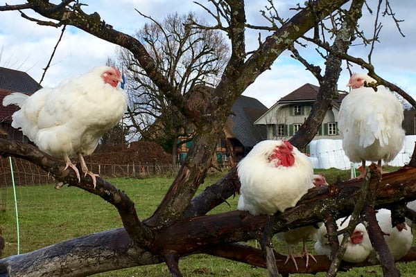 Die weissen Hühner tauft unser Sohn Till alle Frida. Die Braunen Vreni. 50 Stück sind’s. Gackern, Eier legen, regelmässig über den Zaun flattern gehören zum Alltag unserer Hühner. Und wenn Würmer und Gras schnabuliert sind verschieben wir das Hühnermobil mitsamt seiner glücklichen Fracht an einen neuen Standort. Die Eier gibt’s direkt ab Hof. Oder im Q Laden in Bern.